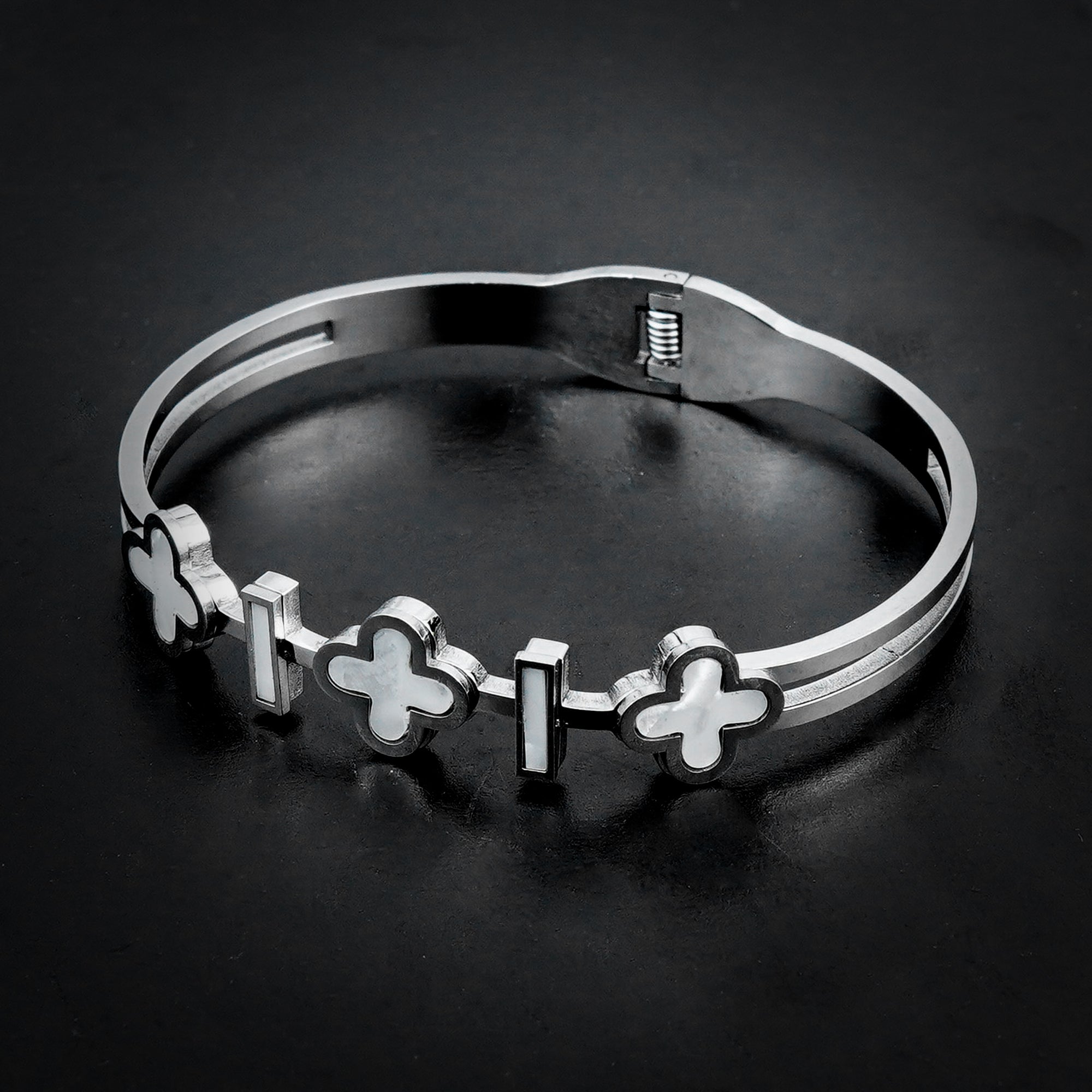 A stylish and elegant bangle featuring a clover design that symbolizes luck and positivity. Its sleek silver finish makes it perfect for both casual and formal wear.